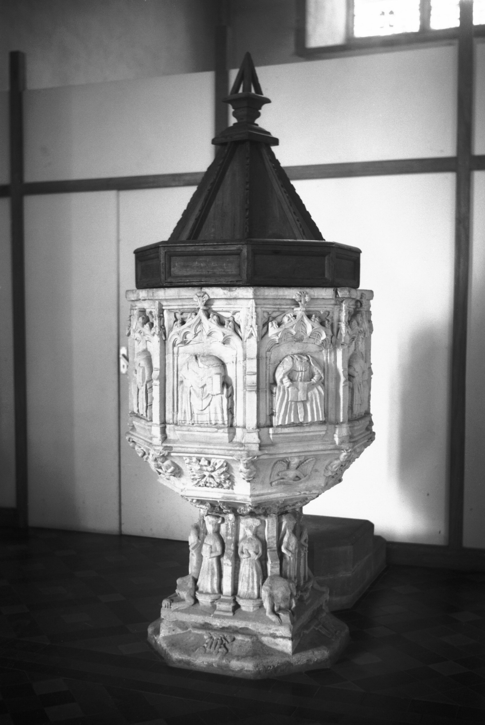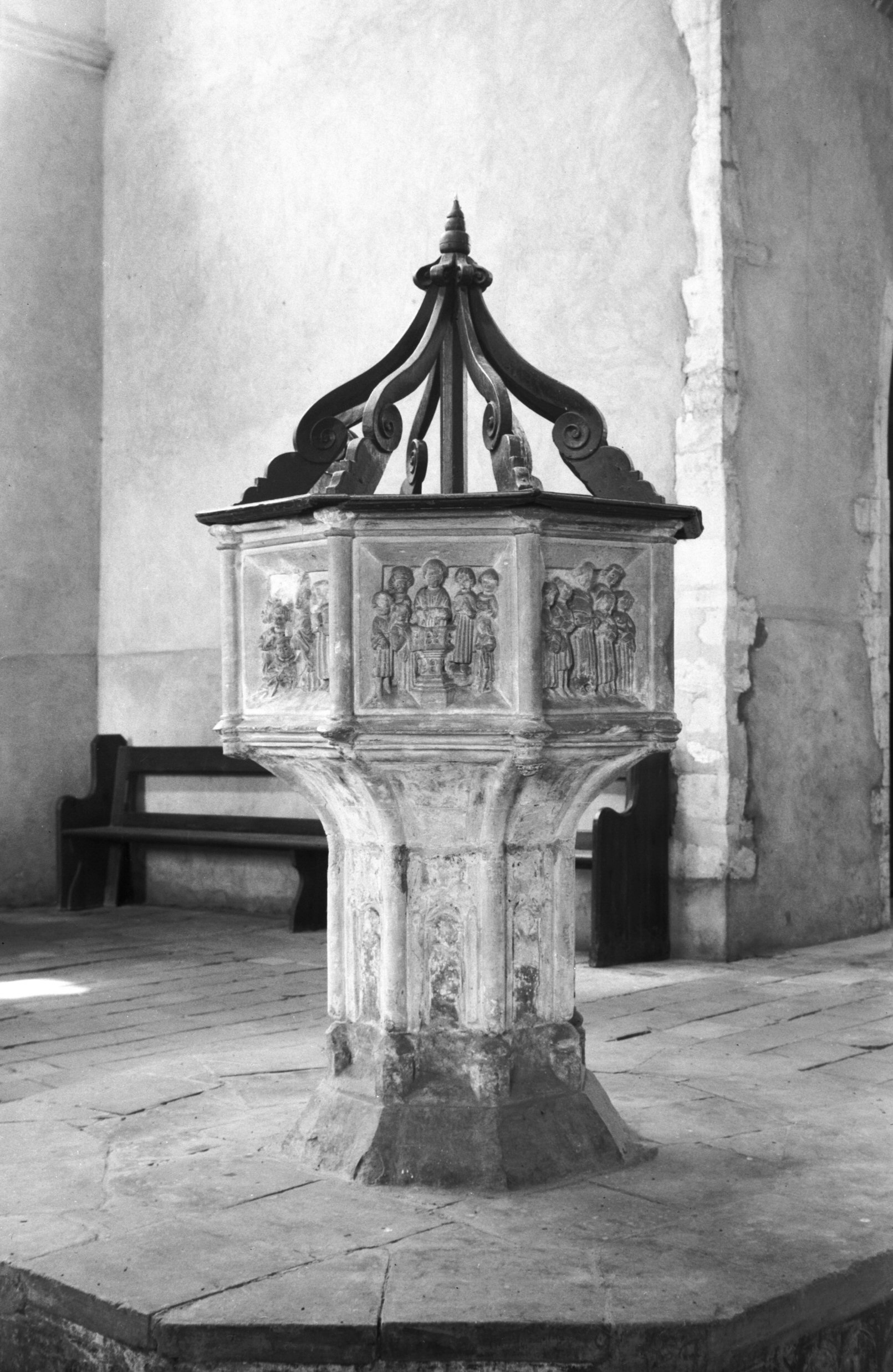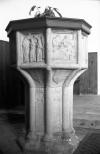 Seven sacrament font. Panels Extreme Unction and Baptism. |