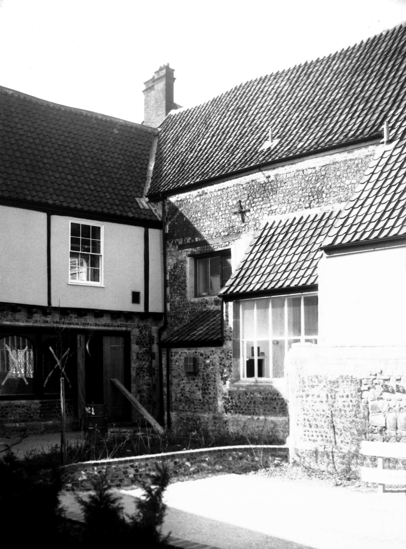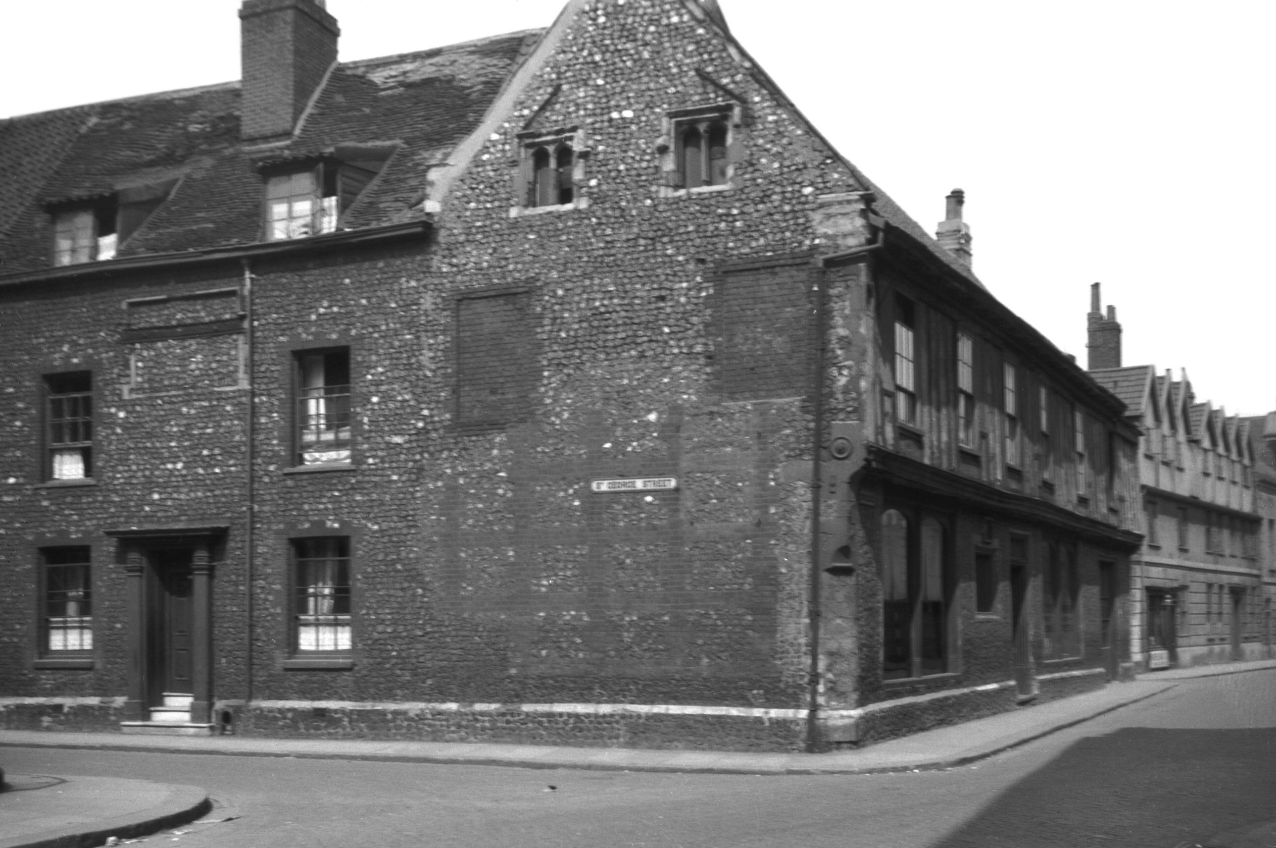 | Colegate 14 to 16 [0878] 1936-04-12 The exterior flint walls are the remains of the house of John Aldrich, grocer, Mayor in 1558 and 1570. |