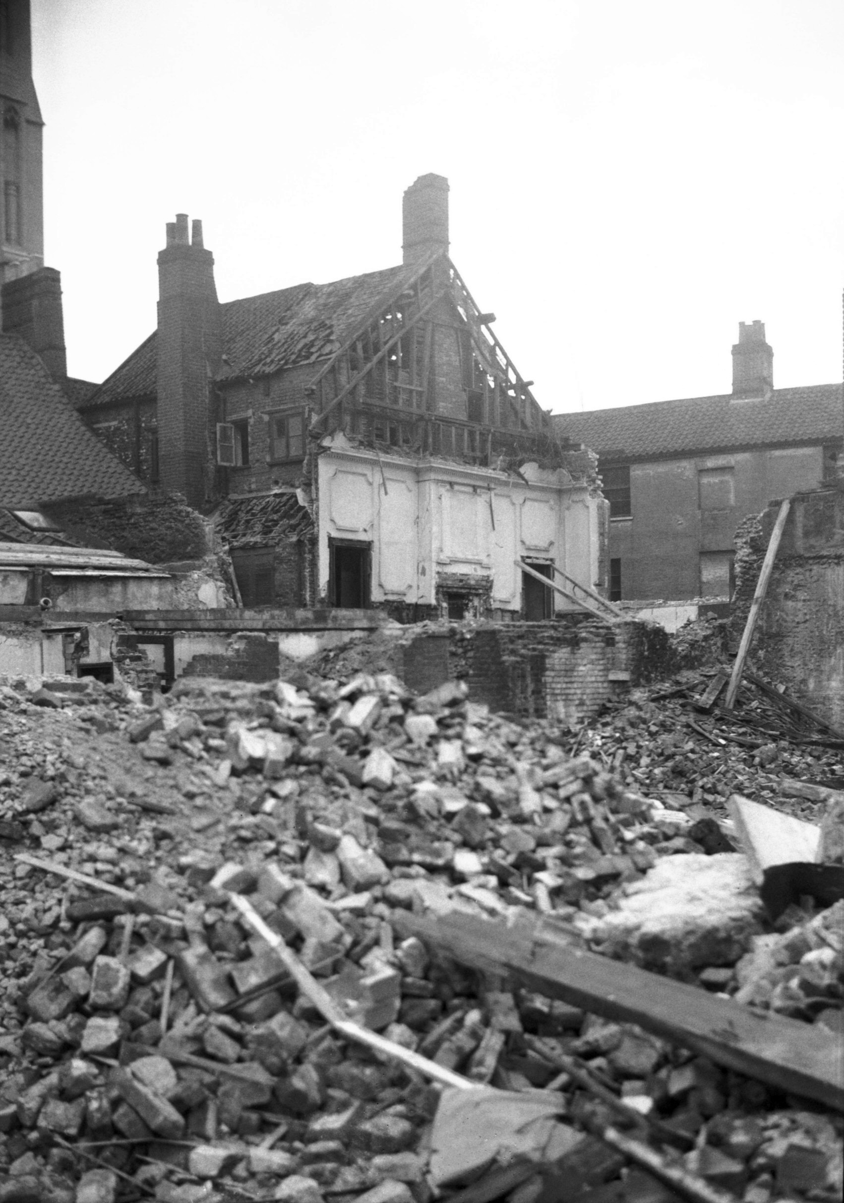 1961-05-05 Former White Swan Inn. Demolition May 1961. Interior east wall of the old play-house is visible on the first floor. |