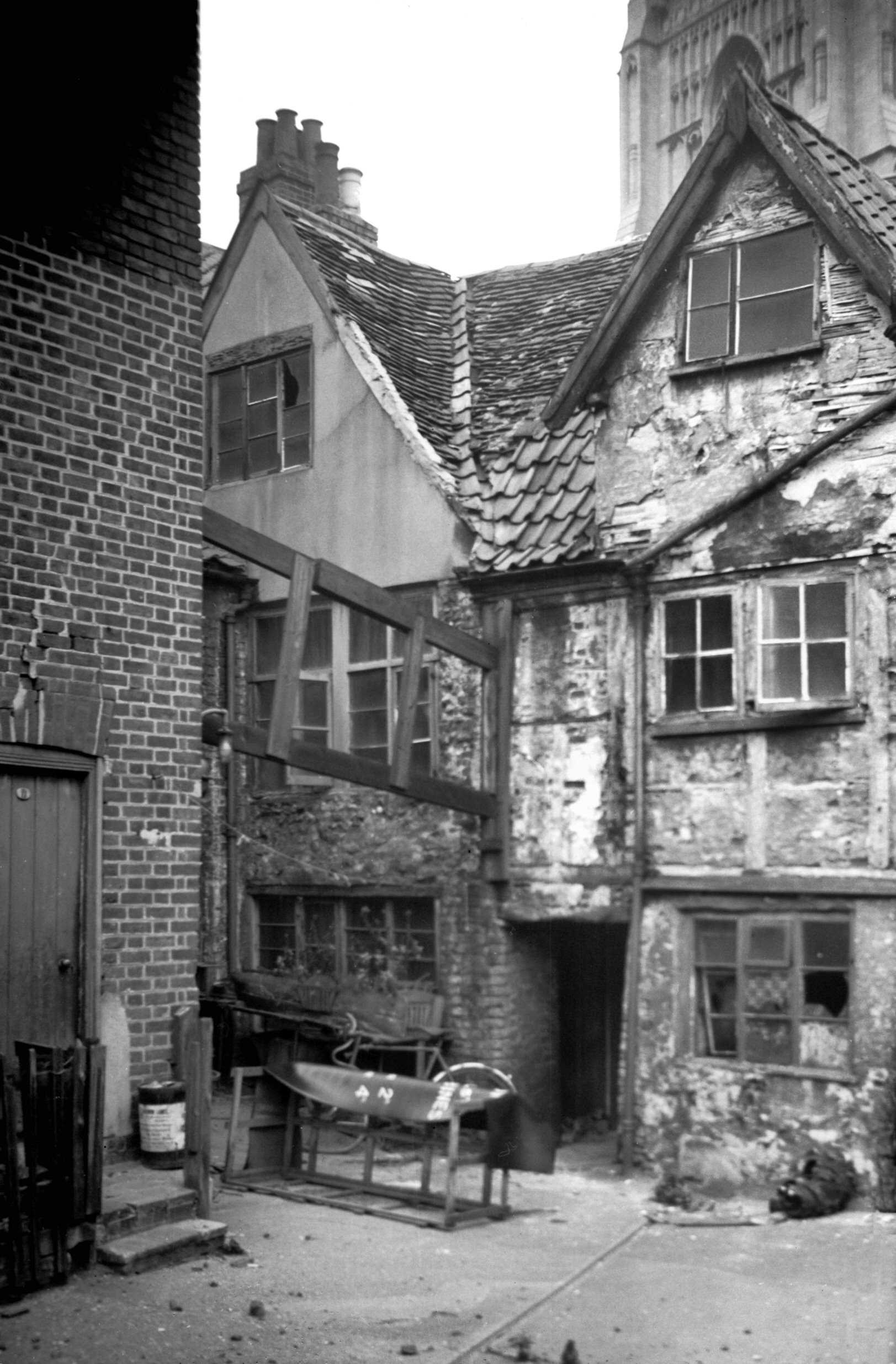 1934-12-11 17 was the former Wounded Hart PH, renamed as Kitchener's Arms during the Great War. It was also originally the Wounded Heart an emblematical representation of the Heart of the Holy Virgin pierced by five swords in allusion to the prophecy of Simeon at the Presentation in the Temple. A portion of the staircase with its balustrade as well as a fireplace surround was earmarked for preservation when the property was demolished. Another half-timbered house stood just behind in Wounded Hart Lane, its site now covered by the City Hall steps. |